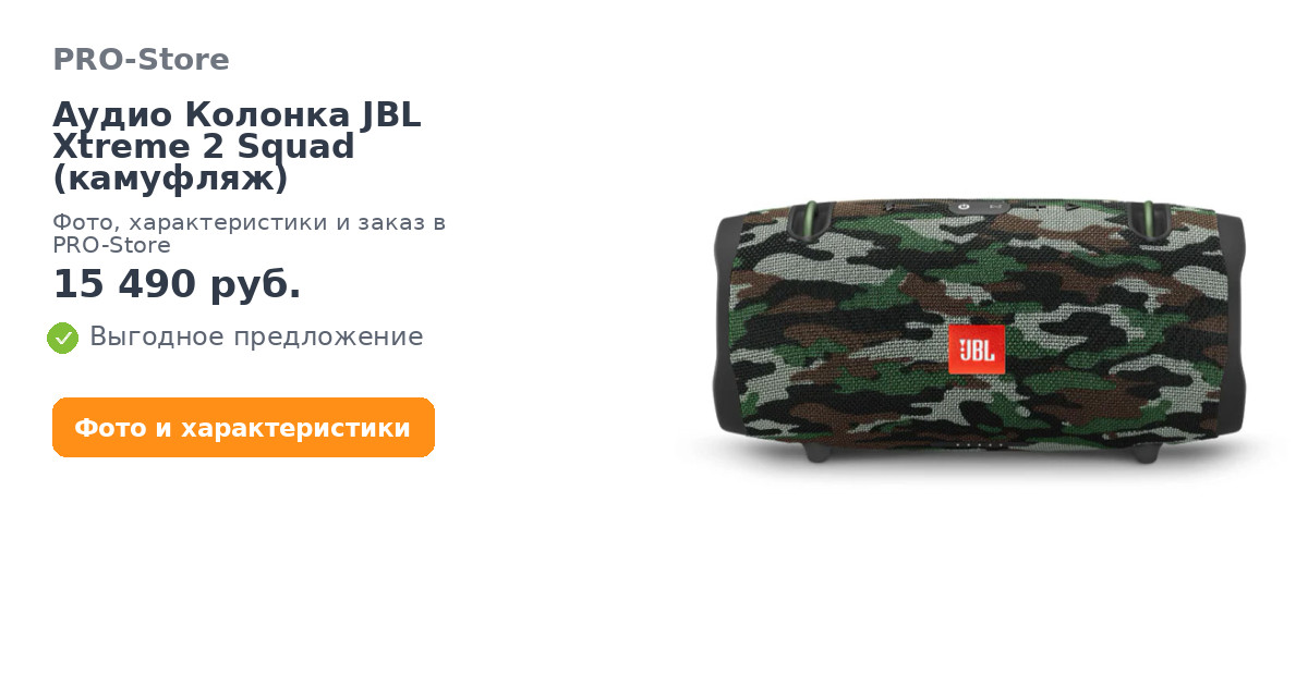 Аудио Колонка JBL Xtreme 2 Squad (камуфляж) в наличии в интернет-магазине PRO-Store. Купите товар онлайн на сайте или можете заказать по телефону: 8 (800) 600-72-72. Цена 17 039 ₽ при оплате онлайн и 15 490 ₽ при оплате наличными. Быстрая доставка по Ставрополю и России. Оплата возможна в рассрочку. В нашем каталоге только оригинальная продукция.