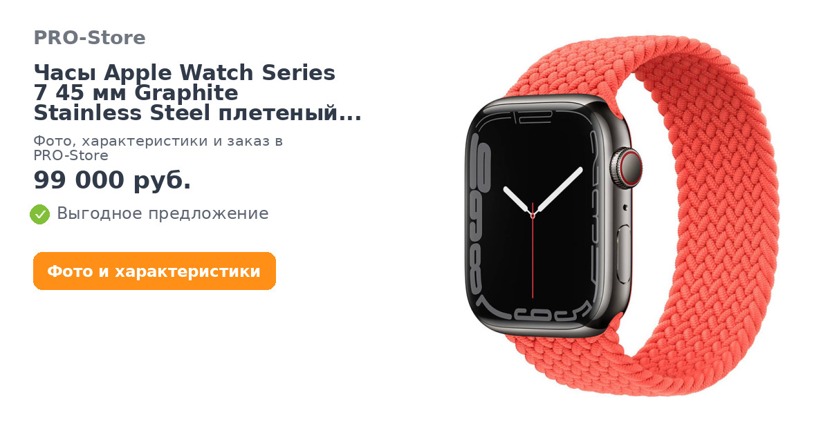 Стальные часы графитового цвета Apple Watch 7 Graphite Stainless Steel case 45mm with Electric Orange Braided Solo Loop плетеный монобраслет цвета «Солнечный апельсин». Плетёный монобраслет — это эластичный ремешок с уникальным дизайном. Он невероятно удобный. Легко надевается и снимается. Создаётся на специальном оборудовании путём сплетения 16 000 волокон переработанного полиэстера вокруг ультратонких силиконовых нитей. Полученный материал затем обрезается точно по размеру при помощи лазера. В результате получается мягкий текстурный ремешок, устойчивый к воздействию воды и пота. Водонепроницаемость до 50 м.