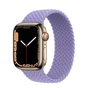 Стальные часы золотого цвета Apple Watch 7 Gold Stainless Steel case 41mm with English Lavender Braided Solo Loop плетеный монобраслет цвета «Английская лаванда». Плетёный монобраслет — это эластичный ремешок с уникальным дизайном. Он невероятно удобный. Легко надевается и снимается. Создаётся на специальном оборудовании путём сплетения 16 000 волокон переработанного полиэстера вокруг ультратонких силиконовых нитей. Полученный материал затем обрезается точно по размеру при помощи лазера. В результате получается мягкий текстурный ремешок, устойчивый к воздействию воды и пота. Водонепроницаемость до 50 м.