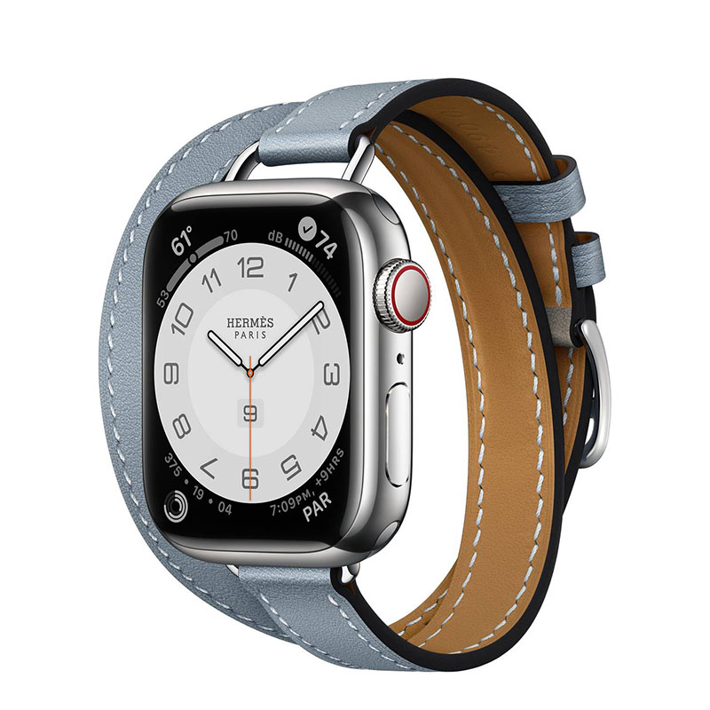 Часы Apple Watch Series 7 Hermes 41mm, Silver Stainless Steel Case with Double Tour Attelage Bleu Lin, GPS + Cellular. Прочный корпус из нержавеющей стали отполирован до зеркального блеска.Double Tour изготовлен из кожи ручной работы и дважды элегантно оборачивается вокруг запястья, создавая культовый образ Hermes.