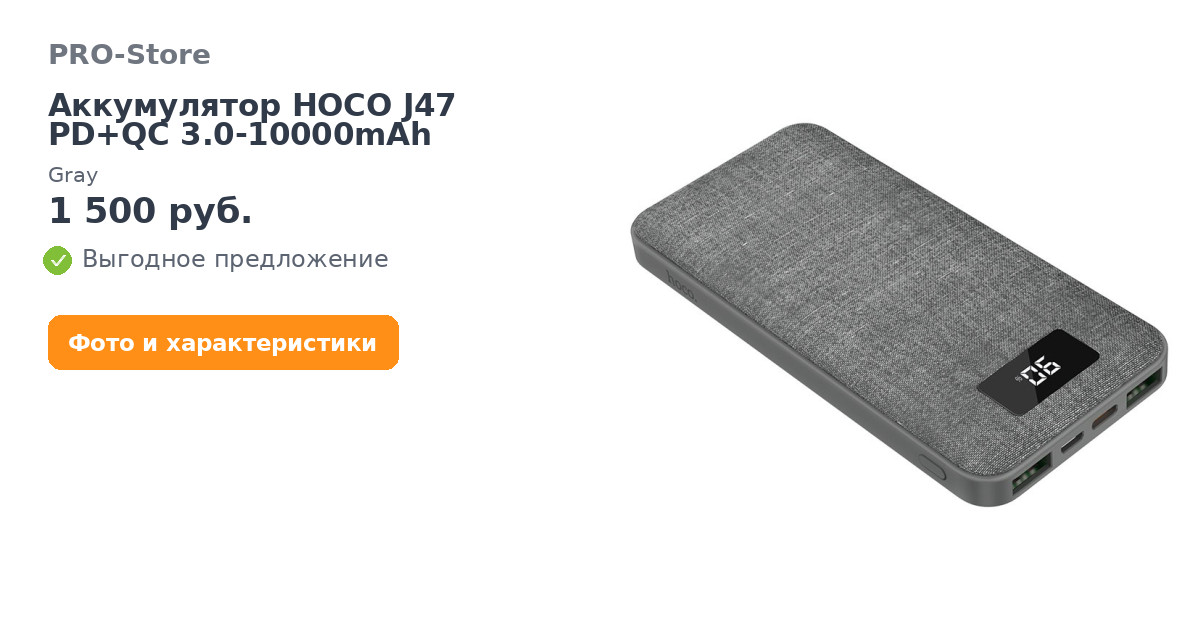 Аккумулятор HOCO J47 PD+QC 3.0-10000mAh Gray в наличии в интернет-магазине PRO-Store. Купите товар онлайн на сайте или можете заказать по телефону: 8 (800) 600-72-72. Быстрая доставка по Ставрополю и России. Оплата возможна в рассрочку. В нашем каталоге только оригинальная продукция.