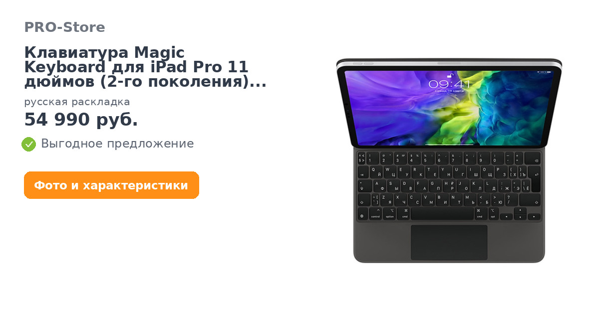 Совершенно новая клавиатура Magic Keyboard станет идеальным дополнением к iPad Pro. С её помощью печатать на iPad удобно как никогда. Встроенный трекпад открывает новые возможности для работы с iPadOS. Порт USB‑C позволяет заряжать iPad. А ещё Magic Keyboard защищает устройство с обеих сторон. Эта клавиатура особой конструкции примагничивается к iPad Pro и удерживает его на весу. При этом можно плавно менять угол наклона, чтобы подобрать идеальное положение.