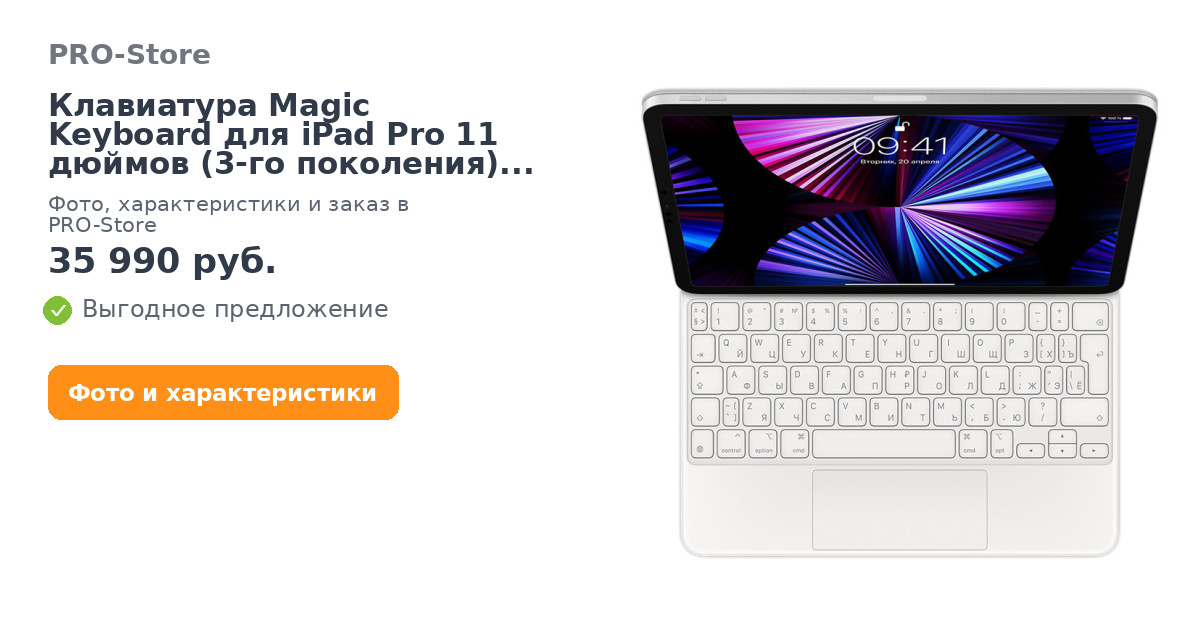 Клавиатура Magic Keyboard станет идеальным дополнением к iPad Pro или iPad Air. Печатать с её помощью невероятно удобно. Встроенный трекпад открывает новые возможности для работы с iPadOS. Порт USB‑C позволяет заряжать iPad. А Magic Keyboard защищает устройство с обеих сторон. Эта клавиатура с особой консольной конструкцией примагничивается к iPad Pro или iPad Air. При этом можно плавно менять угол наклона, чтобы подобрать идеальное положение.