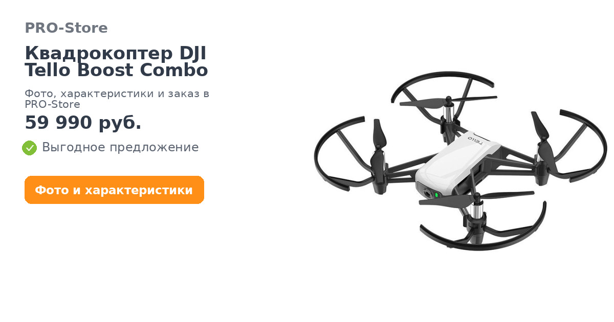 В DJI Tello Boost Combo используется камера высокого разрешения, которая откроет новые возможности съемки фото и видео. Понятное программное обеспечение для смартфонов дает возможность использовать различные режимы съемки и движения коптера. Модель станет отличным решением для тех, кто только знакомится со съемкой при помощи коптера.