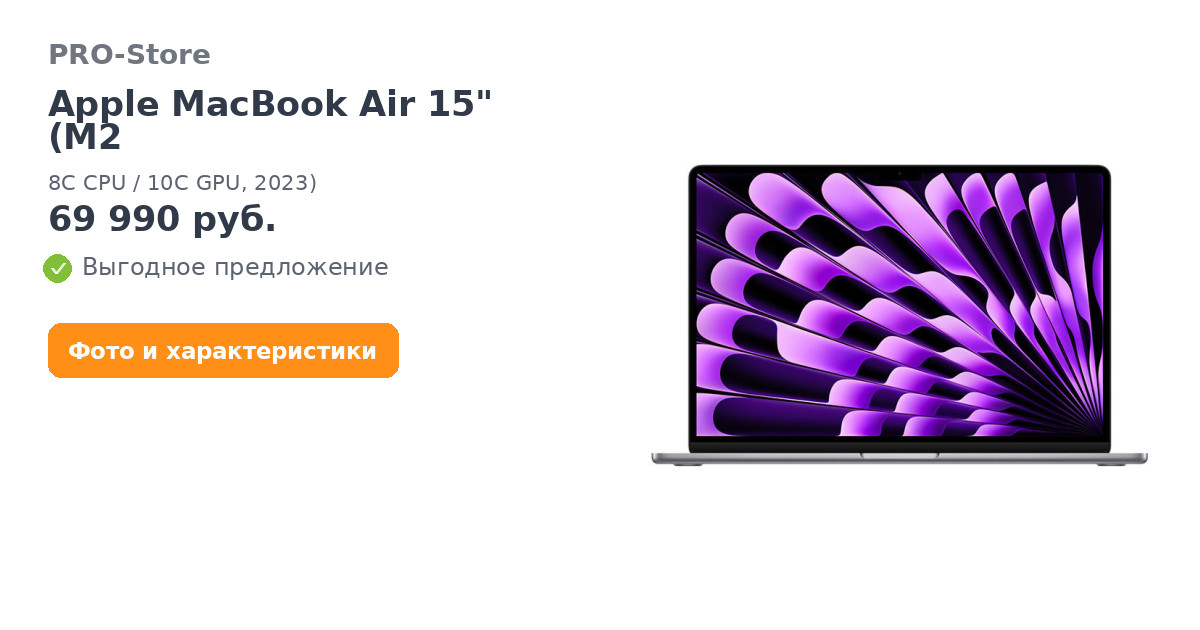Чип M2 повышает скорость всего, что вы делаете — редактируете ли вы видео для занятий, совместно работаете над бизнес-планом или транслируете шоу во время онлайн-покупок. Благодаря длительному времени автономной работы адаптер питания можно оставить дома. По сравнению с портативными ПК с процессором Intel Core i7 MacBook Air обеспечивает в 2 раза более высокую производительность, в 4 до 50% более быстрый просмотр веб-страниц,5 и до 50% более длительное время автономной работы.