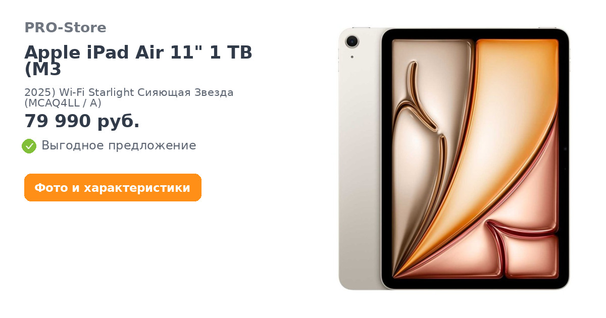 Планшет Apple iPad Air 11" 1 TB (M3, 2025) Wi-Fi Starlight Сияющая Звезда (MCAQ4LL/A)