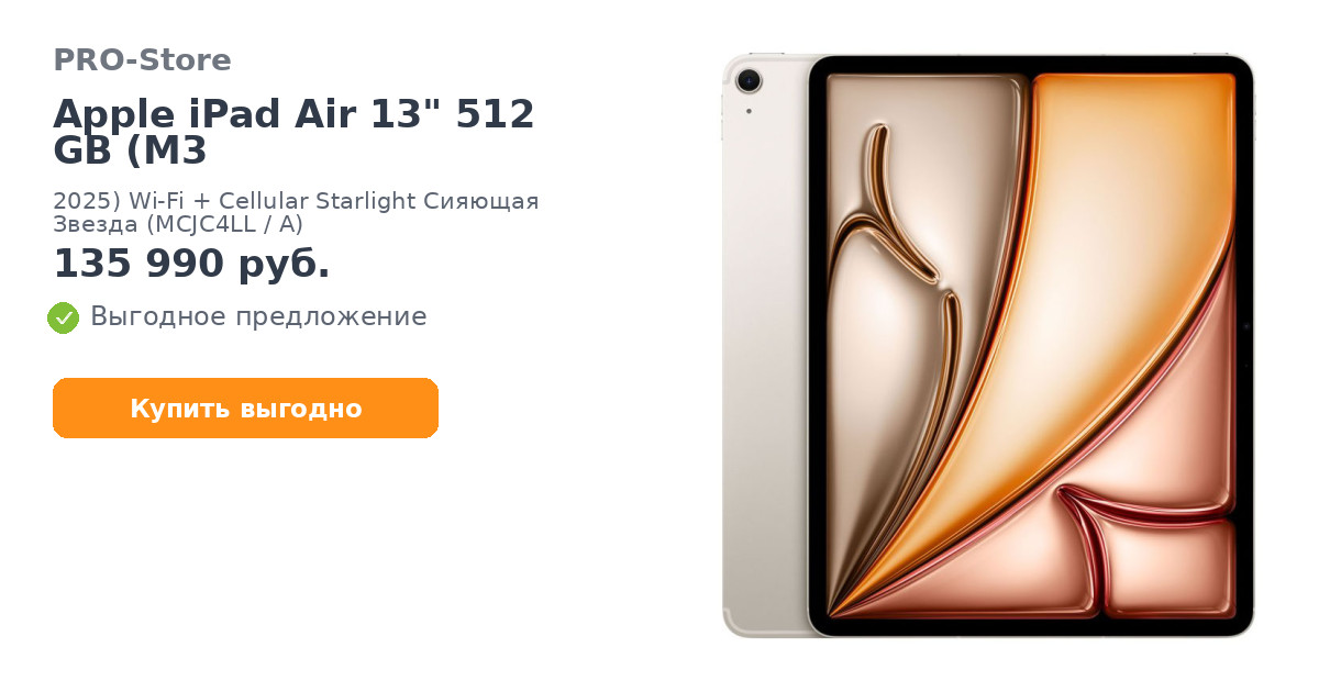 Планшет Apple iPad Air 13" 512 GB (M3, 2025) Wi-Fi + Cellular Starlight Сияющая Звезда (MCJC4LL/A)