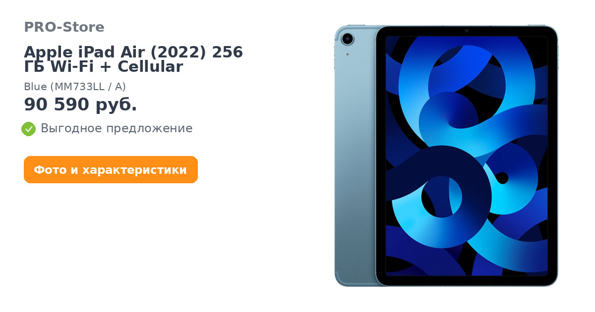 - Комплектация: iPad Air 10,9 дюйма, Зарядный кабель USB‑C, Адаптер питания USB‑C мощностью 20 Вт
