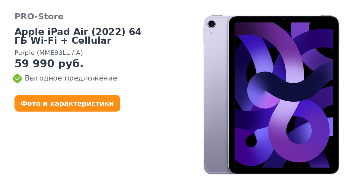 - Комплектация: iPad Air 10,9 дюйма, Зарядный кабель USB‑C, Адаптер питания USB‑C мощностью 20 Вт