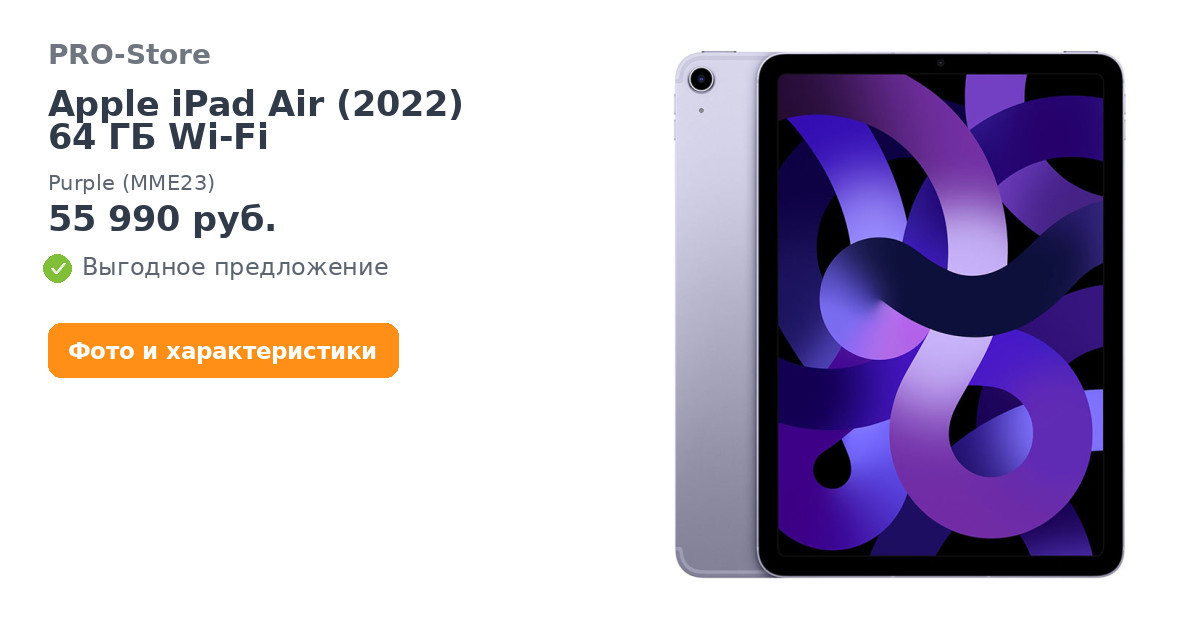 - Комплектация: iPad Air 10,9 дюйма, Зарядный кабель USB‑C, Адаптер питания USB‑C мощностью 20 Вт