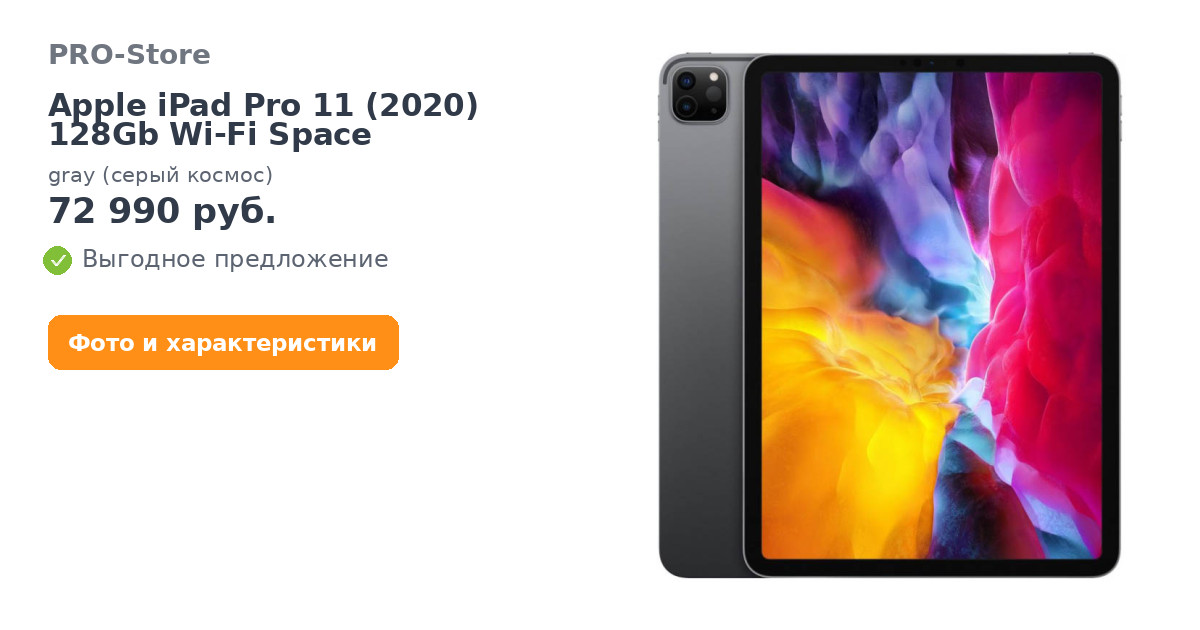 iPad Pro 11 дюймов оснащен потрясающим дисплеем Liquid Retina от края до края.1 Его новые камеры уровня Pro — широкоугольная и сверхширокоугольная — и сканер LiDAR открывают невероятные возможности для передовых приложений с дополненной реальностью. Мощный процессор A12Z Bionic обеспечивает работу всех необходимых приложений и игр со сложной графикой. Поддерживаются Apple Pencil2 и новая клавиатура Magic Keyboard с трекпадом.2 Доступна быстрая связь по Wi‑Fi. Можно работать весь день без подзарядки.3 А наличие миллионов приложений в App Store позволяет использовать iPad Pro для самых разных задач, где бы вы ни были.