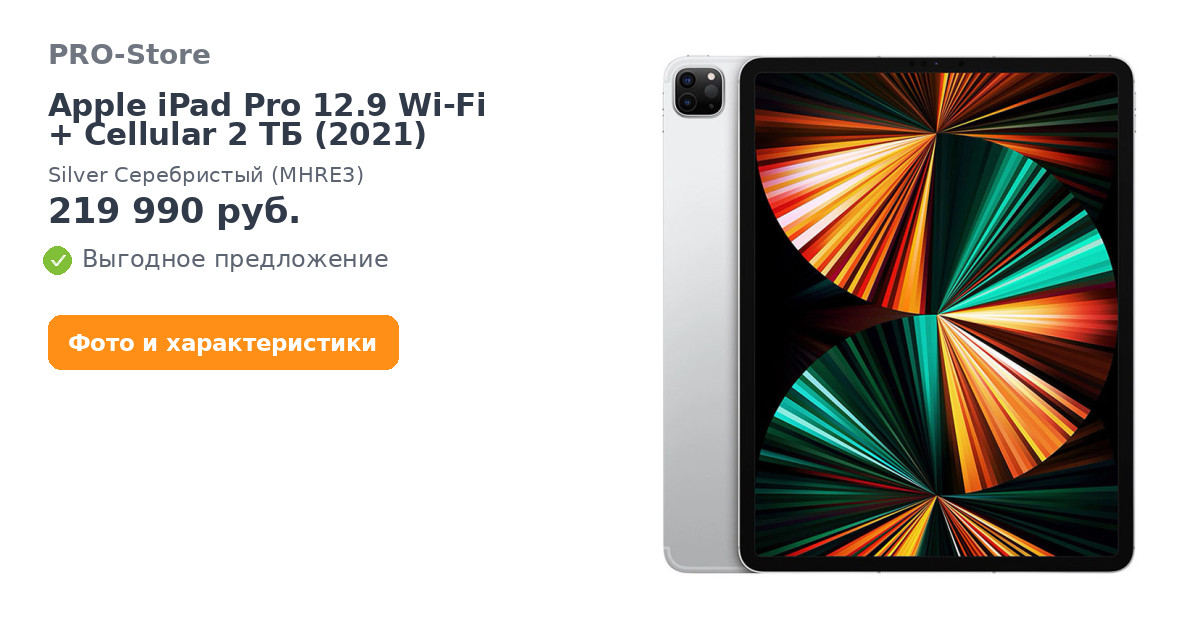 Это высший уровень iPad. Теперь с потрясающей производительностью чипа M1, великолепным дисплеем Liquid Retina XDR 12,9 дюйма и поддержкой быстрой беспроводной связи.◊ Полный вперёд.