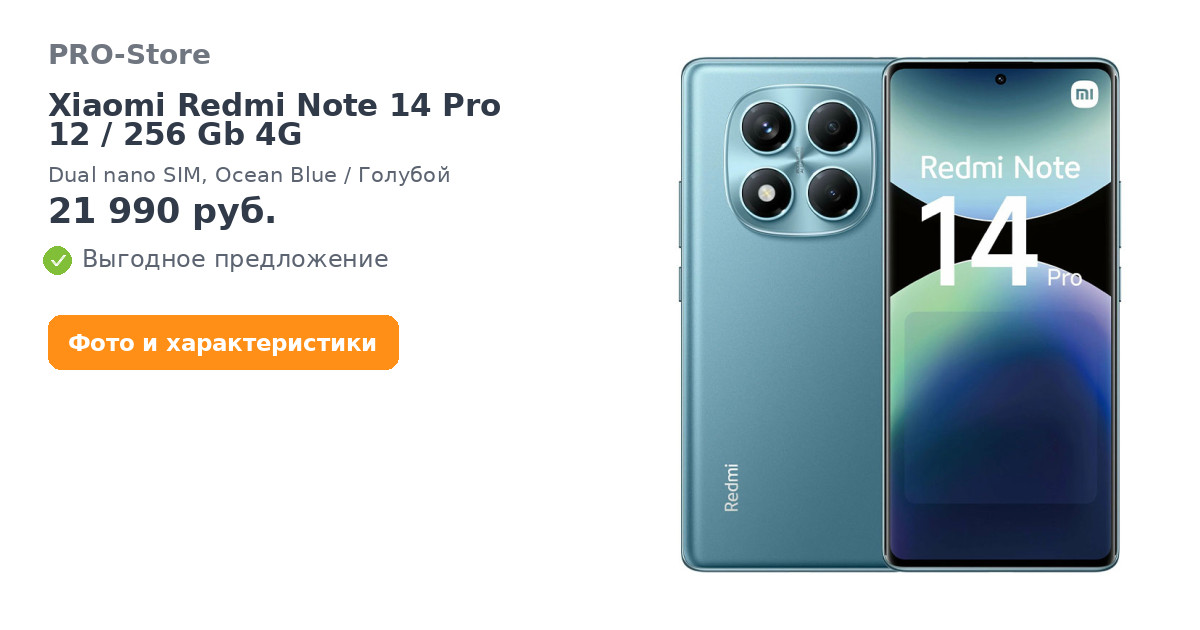 Смартфон Xiaomi Redmi Note 14 Pro 12/256 Gb 4G, Dual nano SIM, Ocean Blue/Голубой