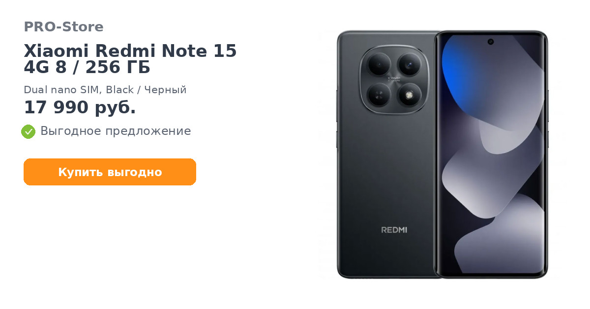 Смартфон Xiaomi Redmi Note 15 4G 8/256 ГБ, Dual nano SIM, Black/Черный