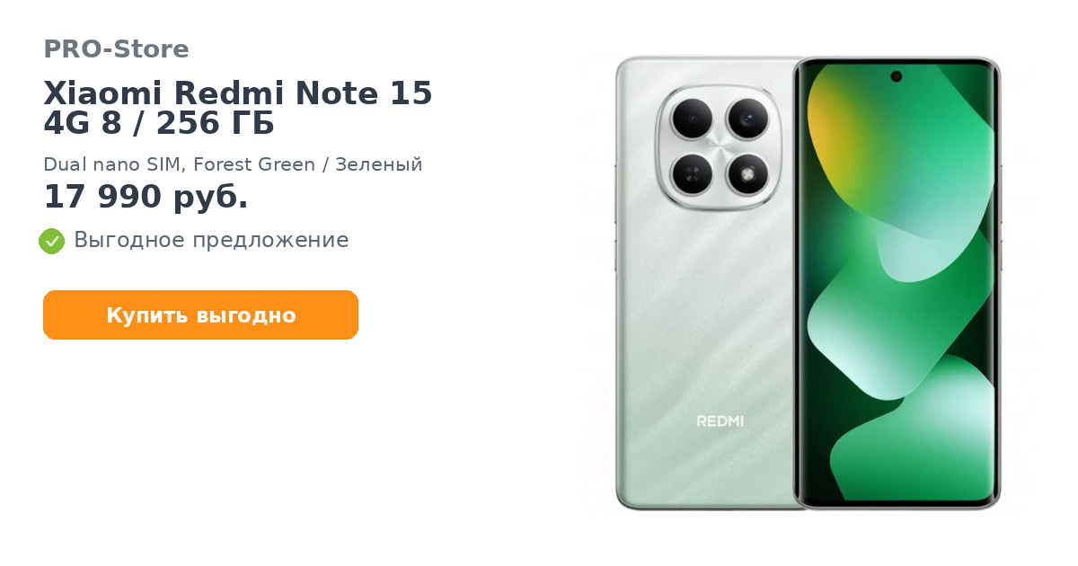 Смартфон Xiaomi Redmi Note 15 4G 8/256 ГБ, Dual nano SIM, Forest Green/Зеленый